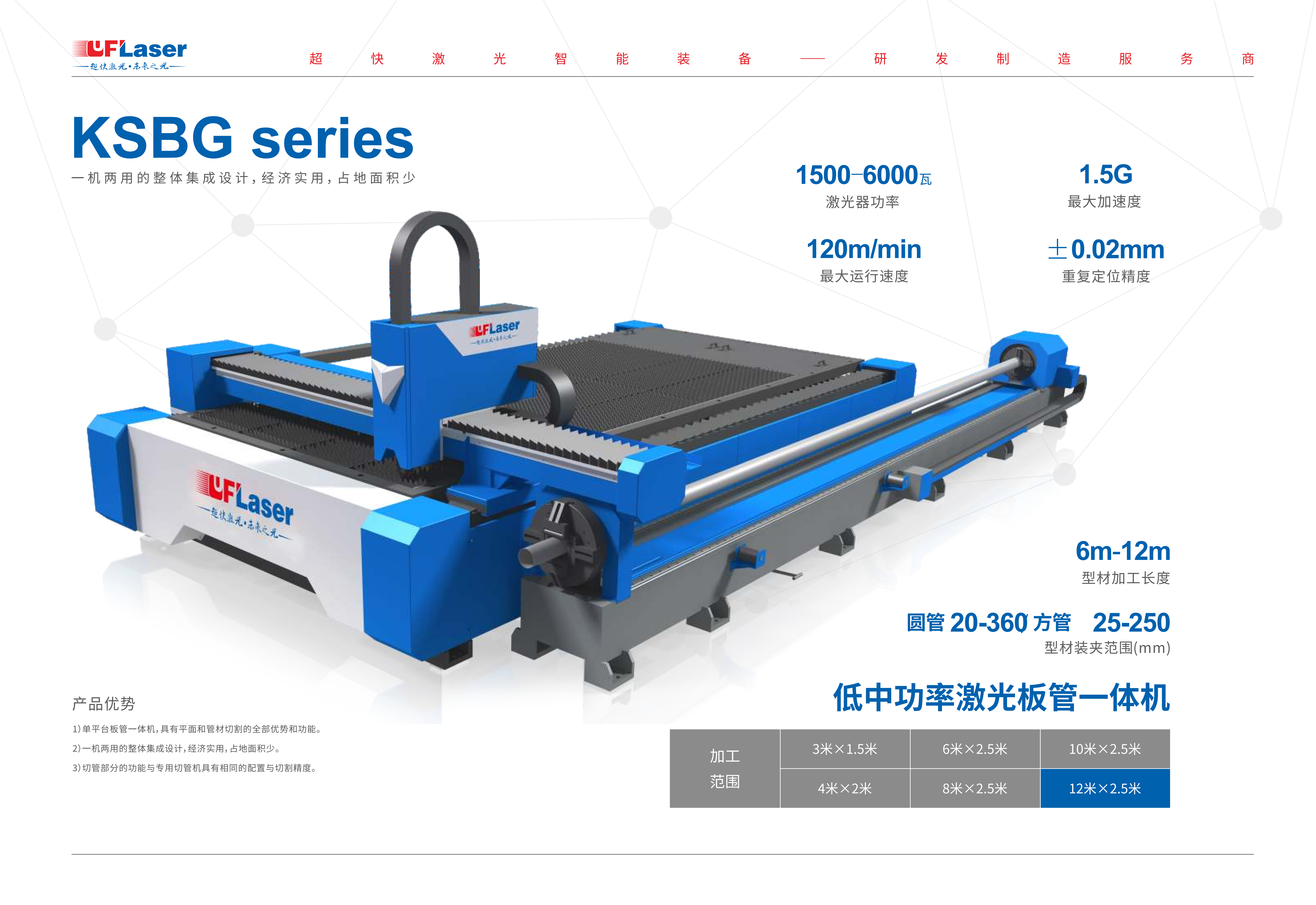 1. 一機(jī)兩用的整體集成設(shè)計,經(jīng)濟(jì)實(shí)用,占地面積少,既可以加工板材又可以加工管材,使用便捷。2.具有獨(dú)特平面切割的全部優(yōu)勢和功能。